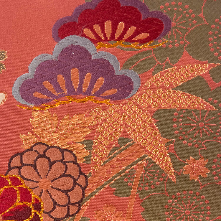 えんじ色に菊、松、かえで等吉祥文を唐織で表現した袋帯です。お太鼓から前腹にかけて、軽微な糸出があります。帯裏は落ち着いた竹色の無地です。振袖から訪問着等にいかがでしょうか。