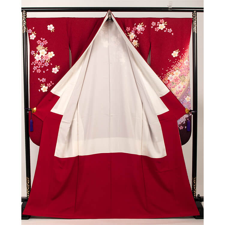 桜が流れるように染め上げた赤い色の振袖です。胴裏はポリエステルです。使用感は少ないです。
