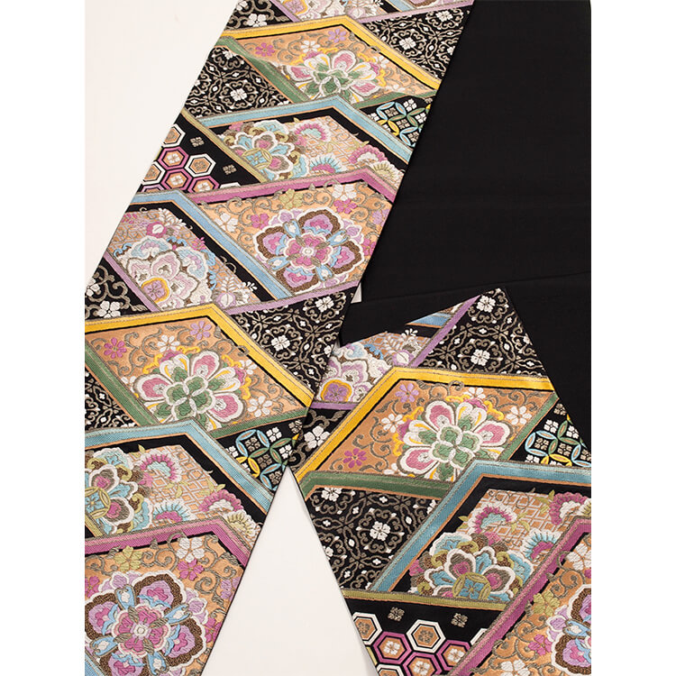 黒地に華紋と菱紋を幾重にも重ねた吉祥柄の六通袋帯です。目立った汚れはありません。振袖用袋帯 帯裏黒地
