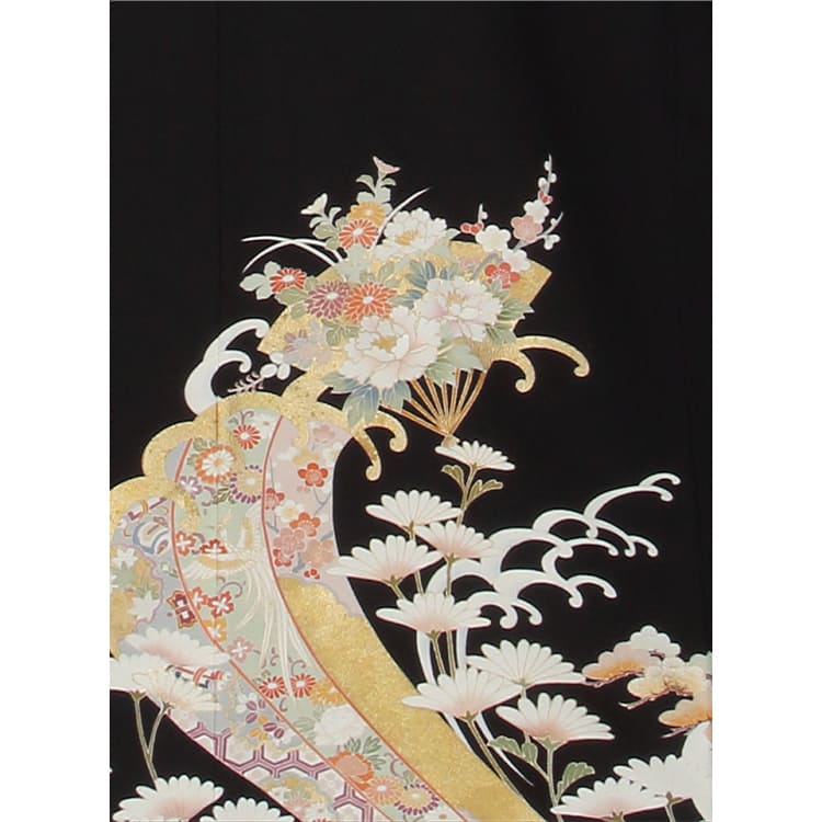 立浪の中に吉祥文様を扇に四季折々の花を染めた留袖。浪の描写に躍動感がある一枚です。