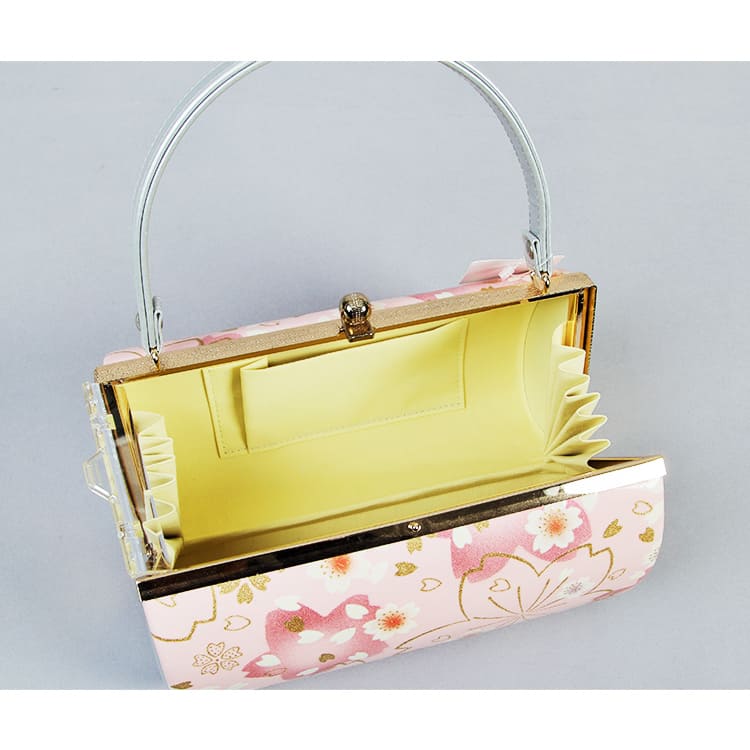 淡いピンクに桜を大小のバック、草履はシルバーにピンクの鼻緒。在庫品のためシミ、汚れ、型崩れ等がある場合があります。
