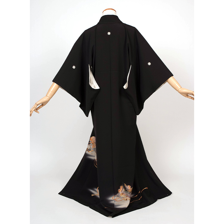 十二単衣の姫柄を金彩と螺鈿で仕上げた、格調高い黒留袖です。多少のシミが見られますが、比較的に程度の良い一枚です。